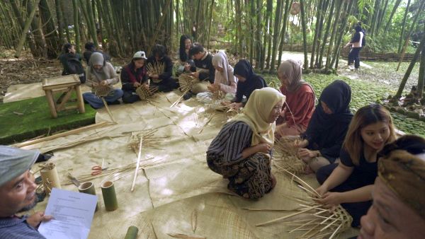 Antusiasme peserta terlihat saat mengikuti workshop menganyam bambu di area Pasar Papringan. Di sela kegiatan, peserta juga diperkenalkan pada Wedang Pring, minuman khas berbahan daun bambu muda dan rempah, sebagai bagian dari identitas kuliner lokal.