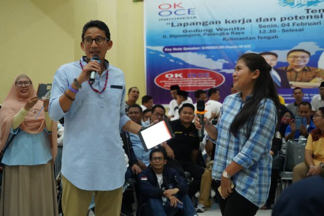Sandi menyatakan ini keluhan yang diterimanya dari beberapa daerah yang dikunjunginya di Indonesia. “Jadi di sini cari kerja susah atau gampang,” tanya Sandi. Para peserta pun serempak menjawab, “susah.”