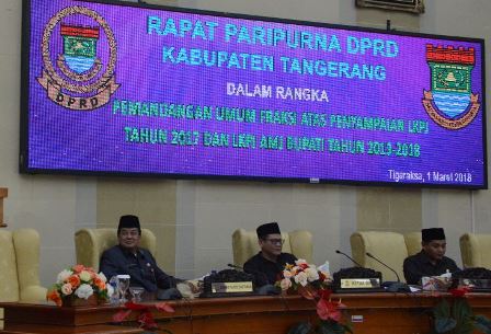 Serpongupdate.com  – Dewan Perwakilan Rakyat Daerah (DPRD) Kabupaten Tangerang kembali menggelar sidang paripurna dengan agenda penyampaian pandangan umum fraksi yang ada di DPRD terhadap LKPJ 2017 dan LKPJ AMJ (Akhir Masa Jabatan) Bupati Tangerang, 2013-2018, Kamis, (1/3/18).