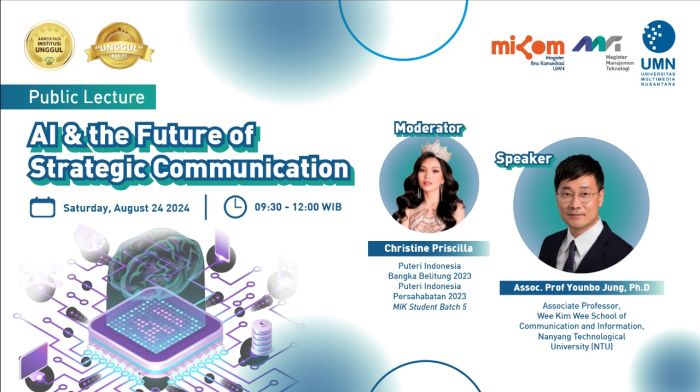 Kuliah umum ini akan membahas mengenai bagaimana salah satu kemajuan teknologi artificial intelligence (AI) dalam bidang komunikasi strategis, mulai dari kegunaan AI, tantangan dan etika. AI dalam strategi komunikasi memang dapat meningkatkan dan mengoptimalisasikan marketing dan juga public relations, sehingga kuliah umum ini akan mengeksplorasi dan mendalami tentang masa depan AI pada bidang komunikasi strategis.