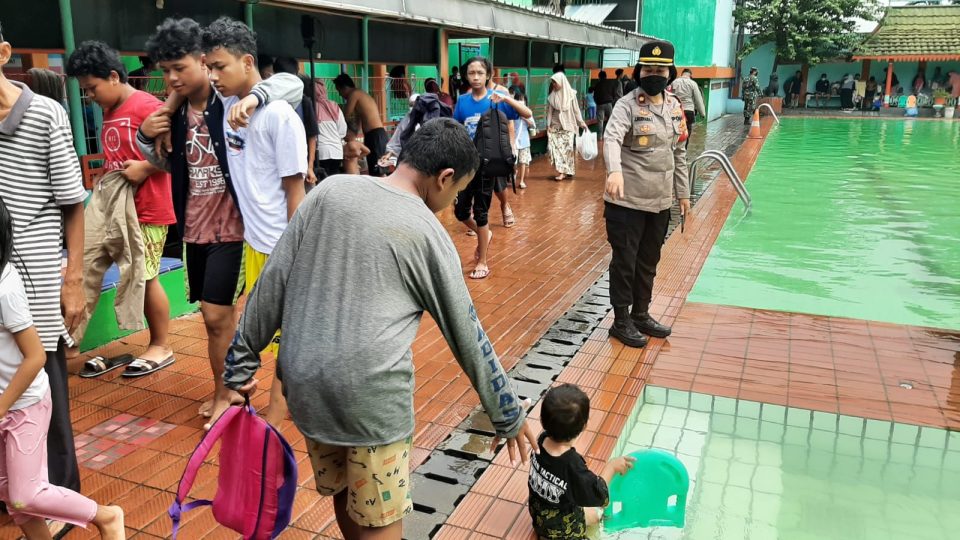 Serpongupdate.com – Personil Polsek Ciputat Timur Polres Tangerang Selatan di bantu Koramil 05 Ciputat membubarkan pengunjung yang berenang di kolam renang umum Tirta Agung Ciputat Kota Tangerang Selatan (Tangsel).