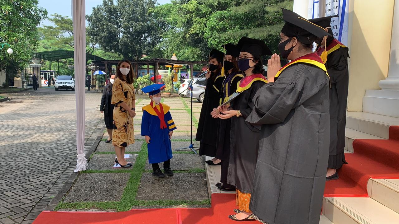 Wisuda secara ‘drive thru’ tersebut dilakukan di anak tangga gedung sekolah. Sehingga memudahkan Maria S. Santy selaku Head of School melakukan penyematan toga wisuda kepada 14 anak angkatan Kindergarten 2.