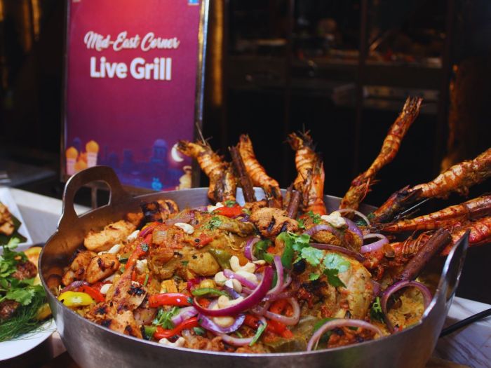 Adapun menu internasional yang akan kami suguhkan di buffet Ramadhan kali ini diantaranya; aneka takjil, hidangan pembuka khas Timur Tengah seperti hummus, tabbouleh, mouttabal, muhammara, fattouch, falafel, fatayer, murtabak, sup dan mie, aneka grill seperti kebab, macam-macam hidangan penutup, salad, korner tradisional, main course dengan dua macam karbohidrat, sayur serta tiga protein.