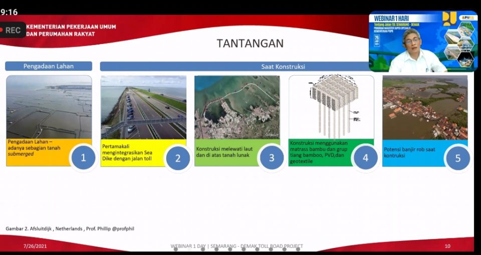 Kepala BPSDM Sugiyartanto menyampaikan pemahaman pelaksanaan pembangunan Tol Semarang-Demak merupakan bagian serial webinar sebagai bahan karya tulis, simulasi, processing data laboratorium atau tempat praktek magang guna peningkatan keahlian teknis terapan. Beberapa substansi yang perlu dipahami dalam pengenalan proyek di antaranya, pembangunan infrastruktur dengan spesifikasi khusus, rancangan desain engineering, metode pelaksanaan konstruksi, tantangan dan kendala serta pembiayaan.